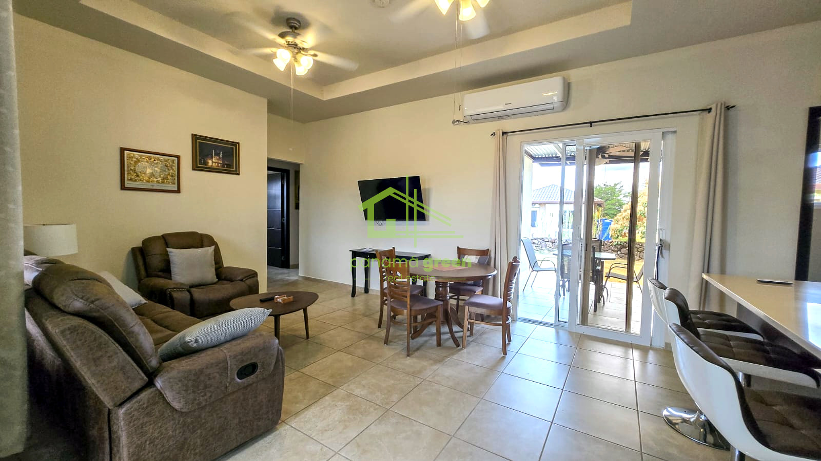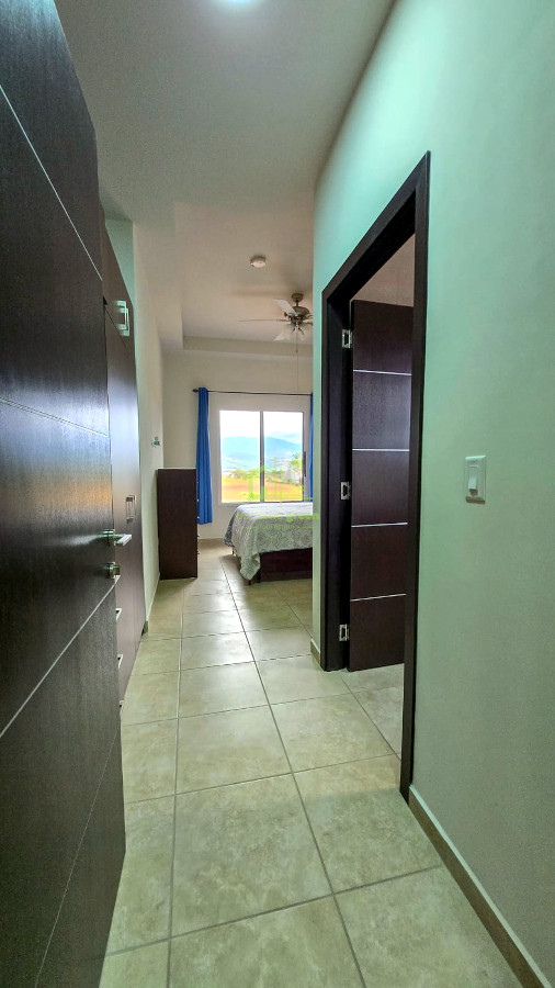This modern home features a bright open-concept living and dining area, a functional kitchen, and large windows that allow plenty of natural light while showcasing the surrounding views. The property includes air conditioning and ceiling fans, ensuring year-round comfort in Boquete’s pleasant climate.