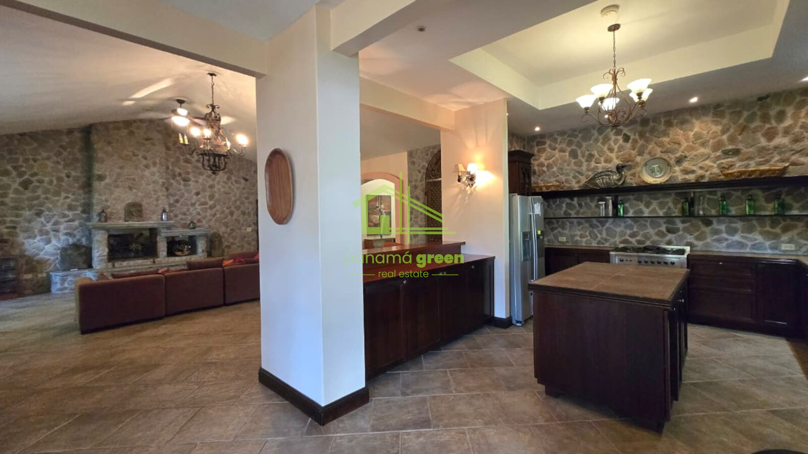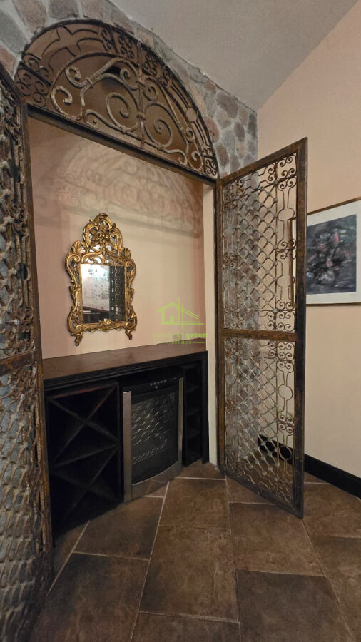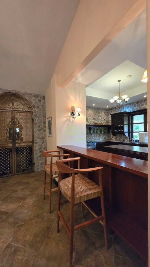 The home is a single-level residence, beautifully designed with a timeless architectural style that blends stone, solid wood, and high-quality finishes throughout. It is fully furnished, featuring carefully selected décor, custom woodwork, and elegant lighting that create a warm yet refined atmosphere.
